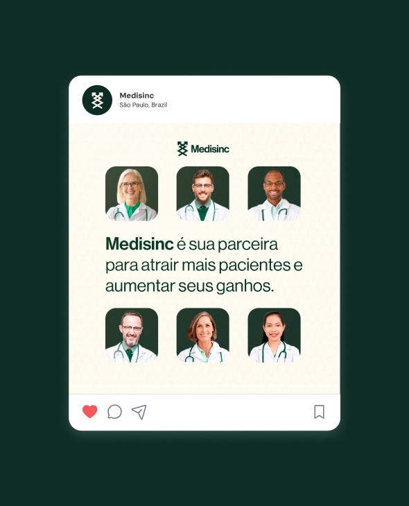Naming, branding completo e identidade visual para a Medisinc, agência de marketing digital especializada em atração de pacientes para clínicas médicas.